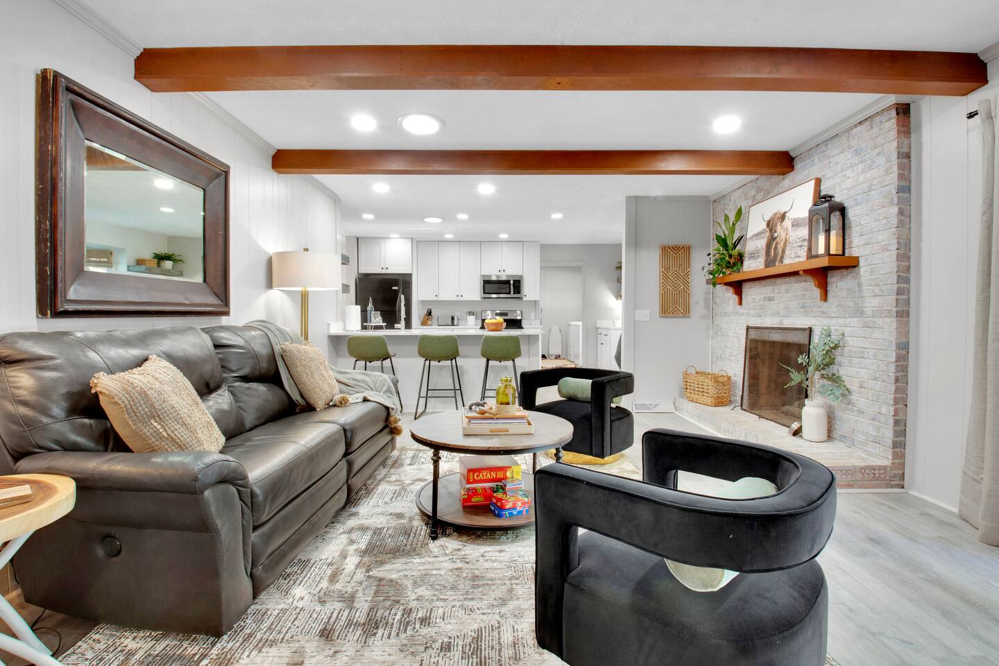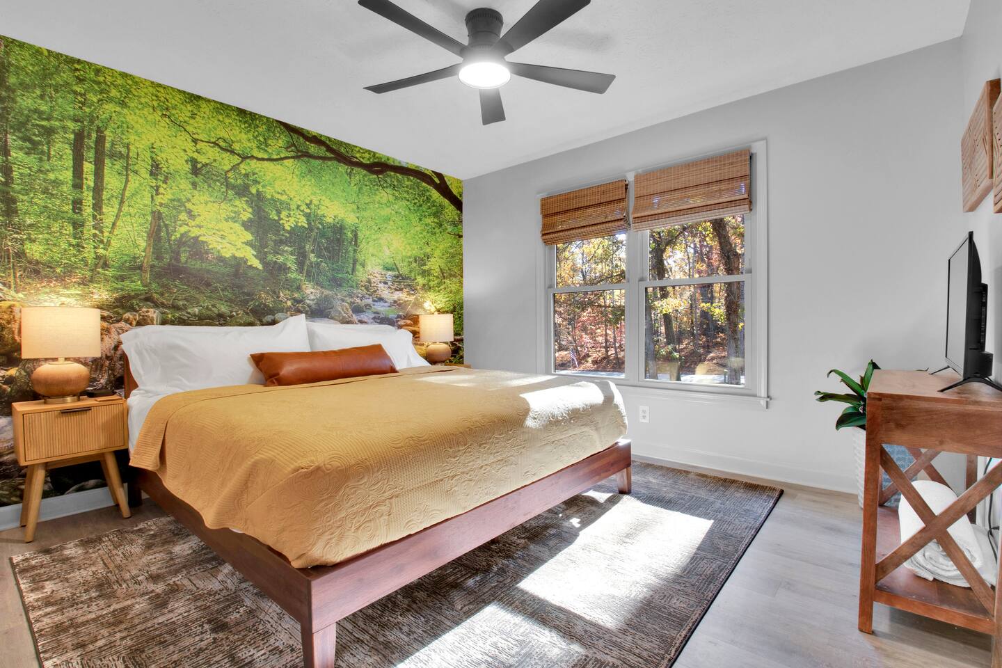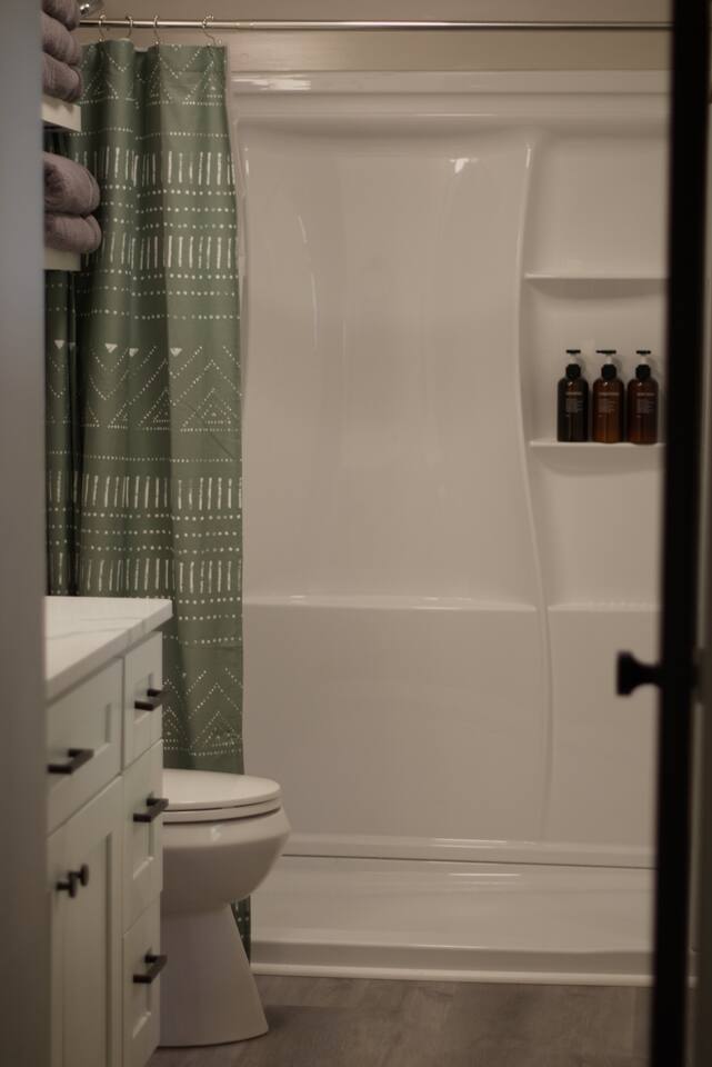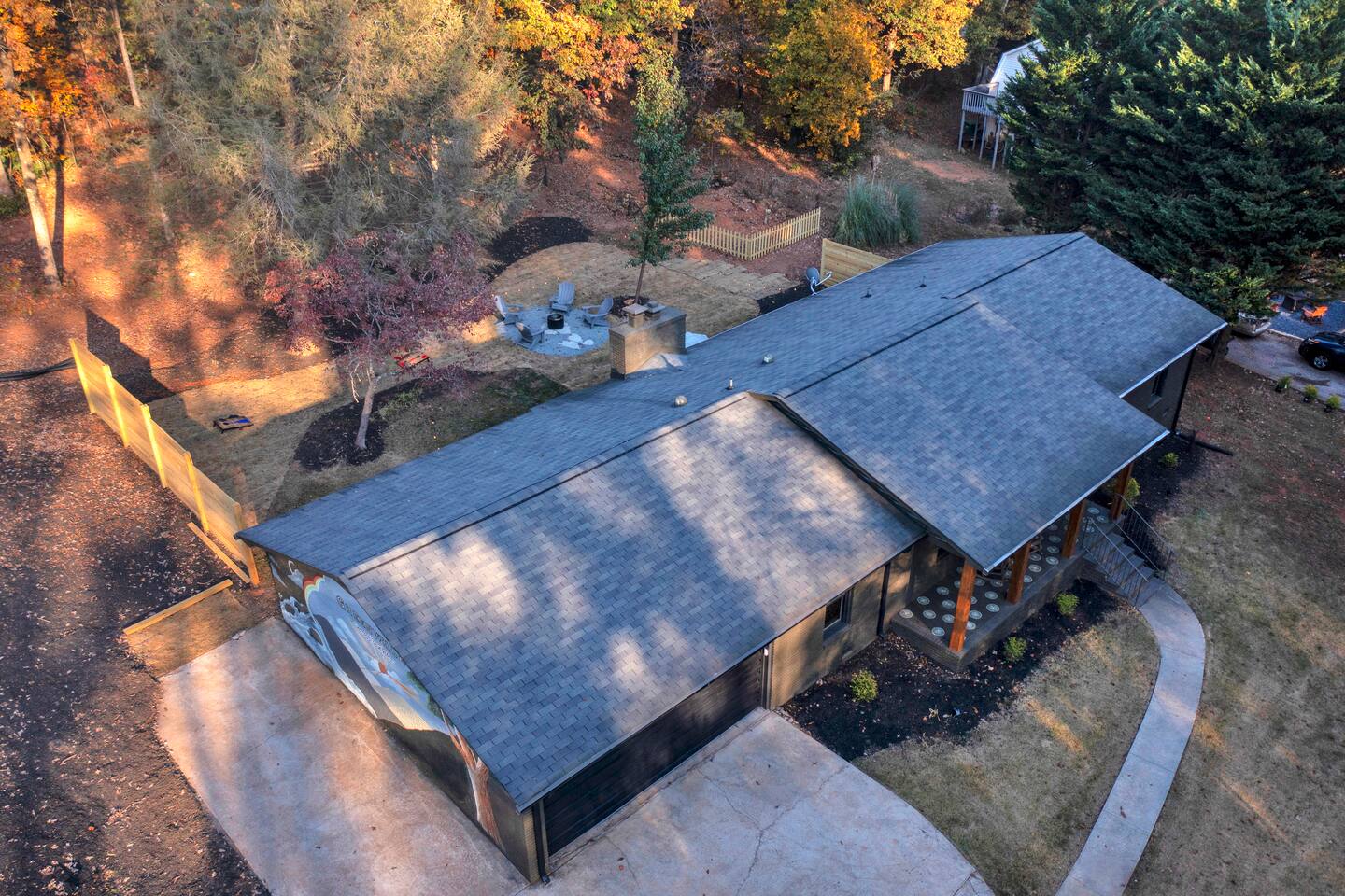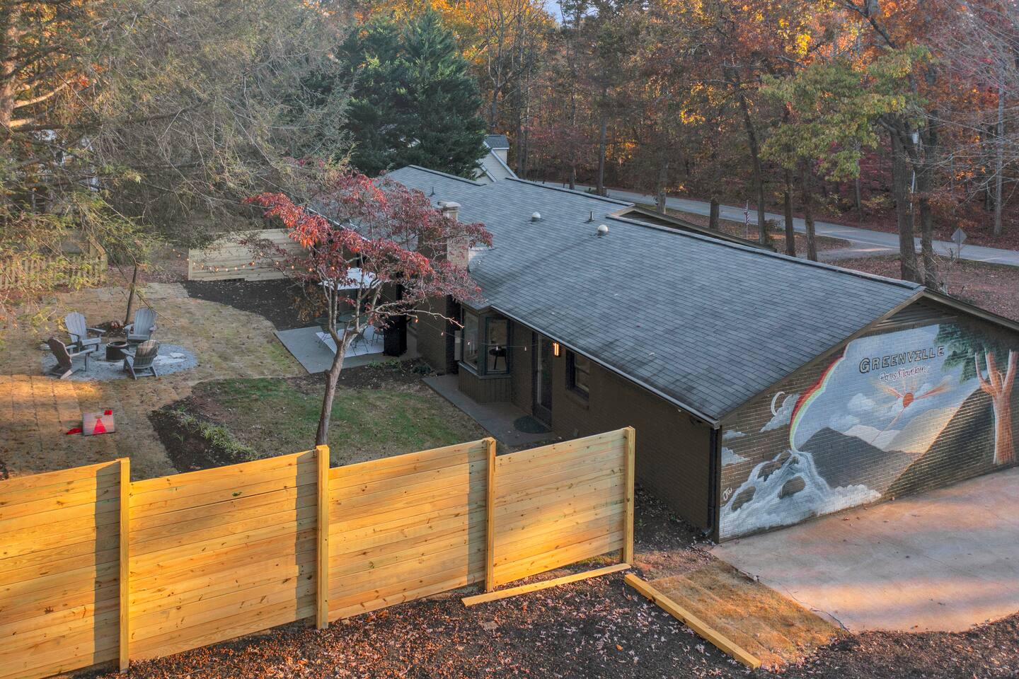 Master bedroom has a 12" Green Tea Memory Foam King bed with an ensuite walk-in shower and TV 2nd bedroom has the same king mattress with a TV 3rd bedroom has two 12" Memory Foam Full beds. Central Guest Bathroom with Tub/Shower Hi Speed Internet and desk area. Keurig pods and coffee pot, filters, Onsite washer & dryer laundry soap, spacious kitchen stocked with spices, olive oil, salt/pepper, Ninja blender, garbage bags, ziplocks, toilet paper, and paper towels. One large TV in the main living room, as well as a second TV in the family room. Large bathpatio space with fire pit, outdoor tables and seating, gas grill, corn hole and ping pong in the garage. We offer firewood too! Great outdoor spaces on the front and back for reading a book or enjoying conversations with friends and family! The mural on the side of our home was painted by my daughter. :)