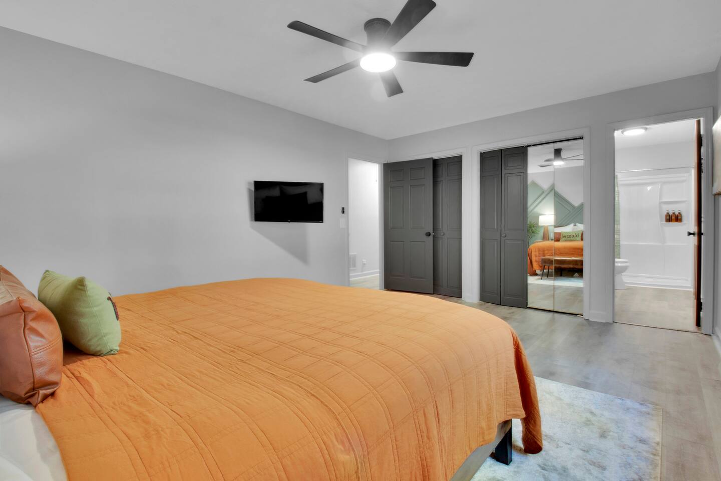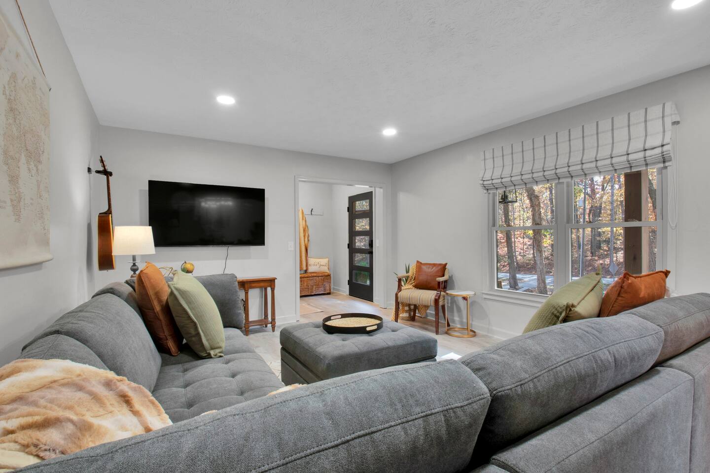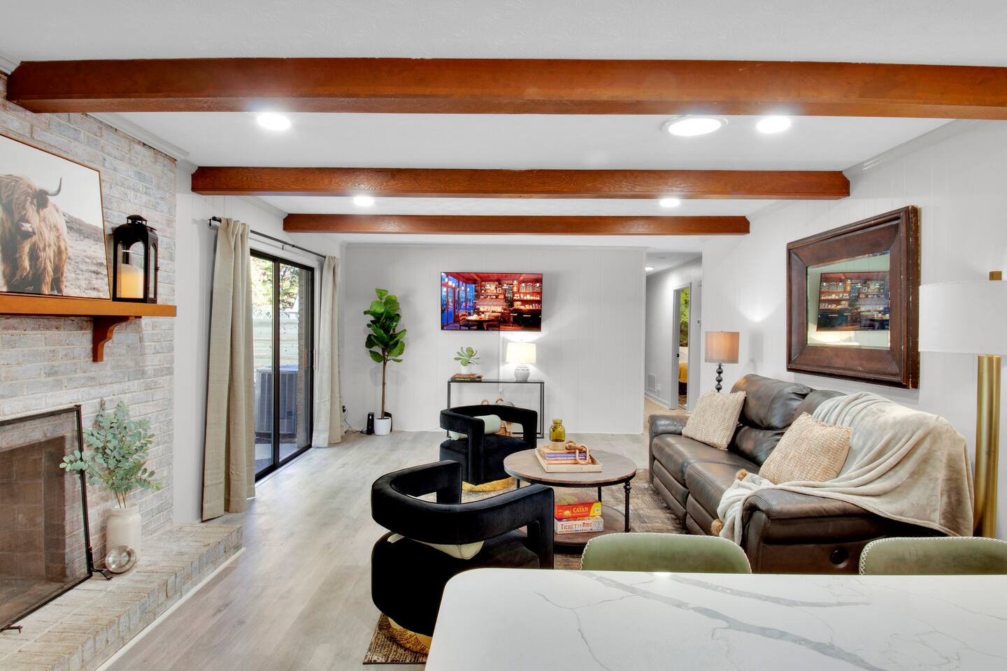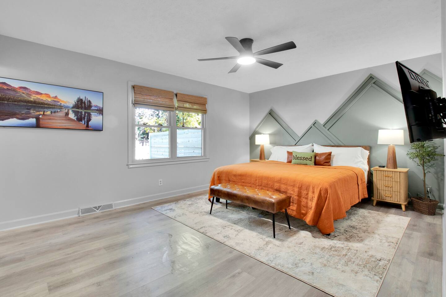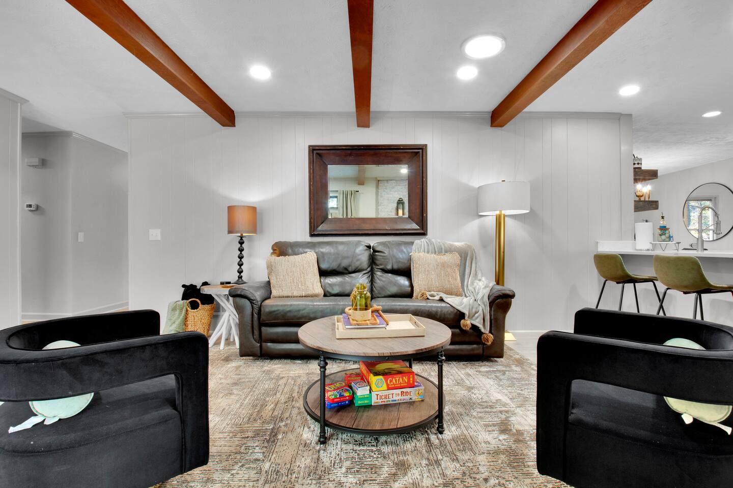 Master bedroom has a 12" Green Tea Memory Foam King bed with an ensuite walk-in shower and TV 2nd bedroom has the same king mattress with a TV 3rd bedroom has two 12" Memory Foam Full beds. Central Guest Bathroom with Tub/Shower Hi Speed Internet and desk area. Keurig pods and coffee pot, filters, Onsite washer & dryer laundry soap, spacious kitchen stocked with spices, olive oil, salt/pepper, Ninja blender, garbage bags, ziplocks, toilet paper, and paper towels. One large TV in the main living room, as well as a second TV in the family room. Large bathpatio space with fire pit, outdoor tables and seating, gas grill, corn hole and ping pong in the garage. We offer firewood too! Great outdoor spaces on the front and back for reading a book or enjoying conversations with friends and family! The mural on the side of our home was painted by my daughter. :)