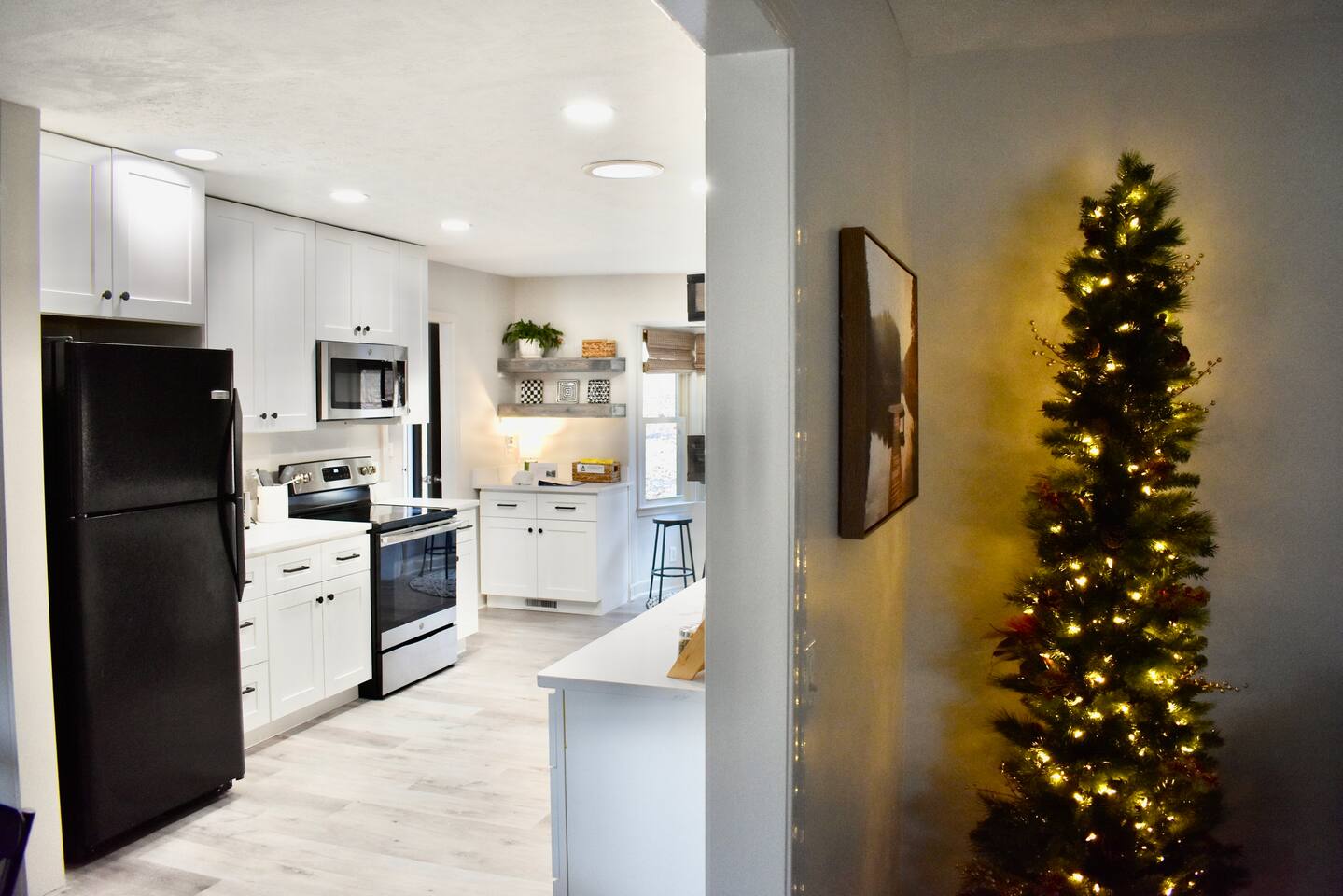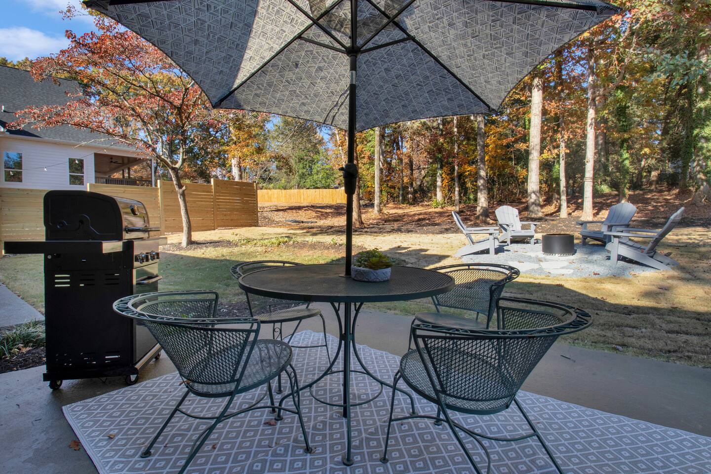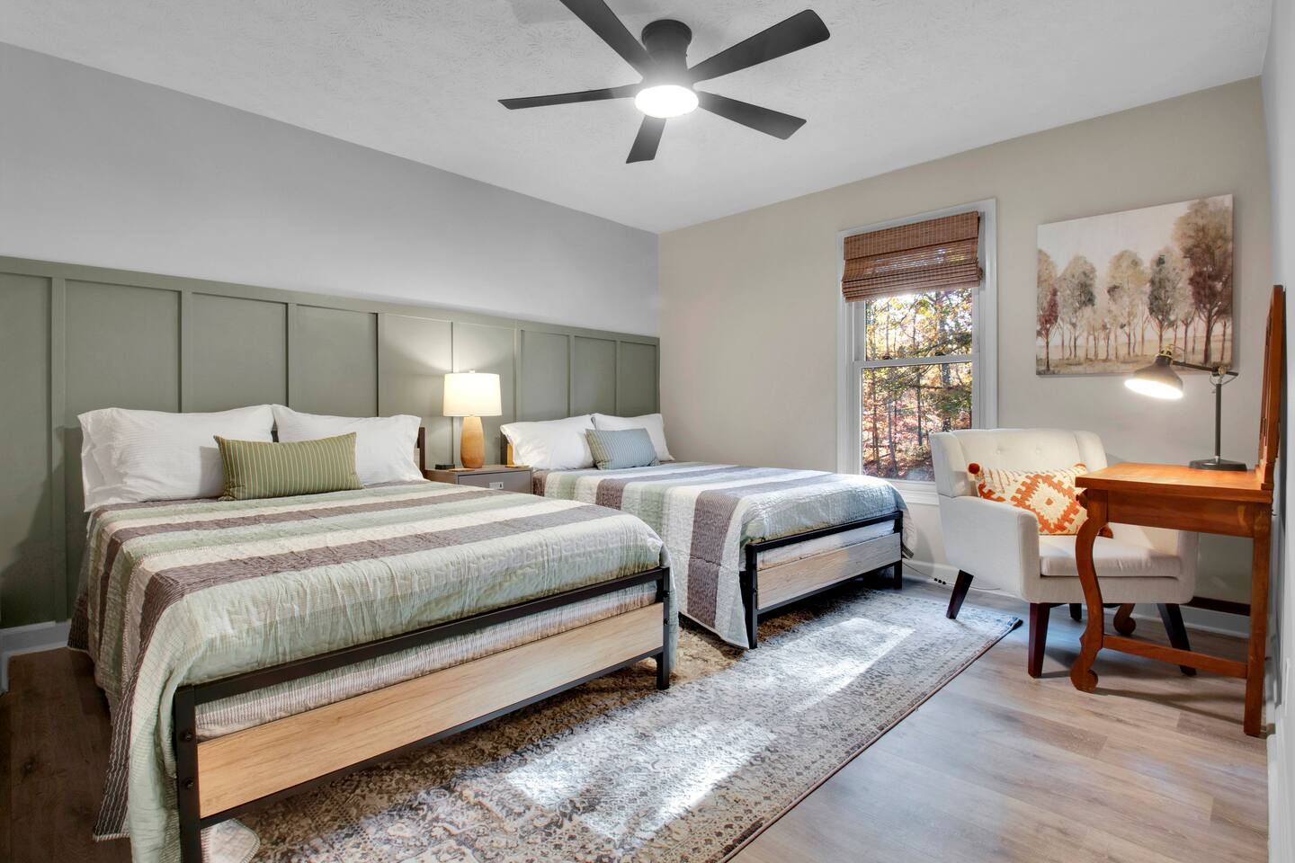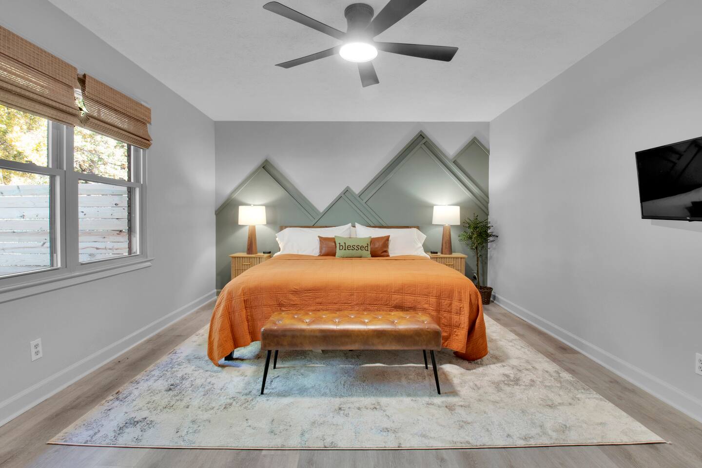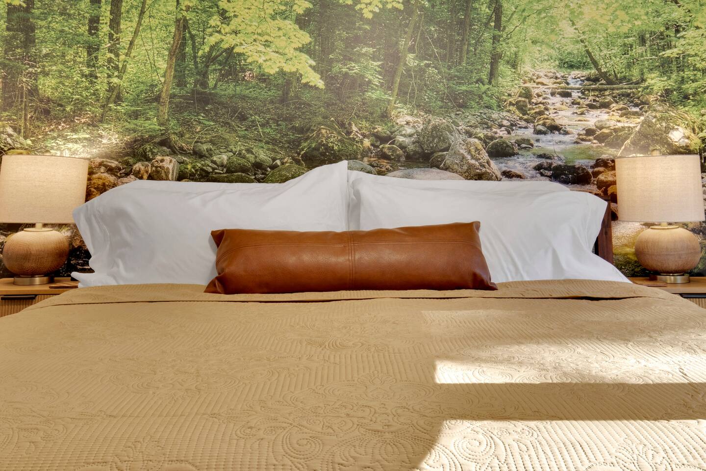 Master bedroom has a 12" Green Tea Memory Foam King bed with an ensuite walk-in shower and TV 2nd bedroom has the same king mattress with a TV 3rd bedroom has two 12" Memory Foam Full beds. Central Guest Bathroom with Tub/Shower Hi Speed Internet and desk area. Keurig pods and coffee pot, filters, Onsite washer & dryer laundry soap, spacious kitchen stocked with spices, olive oil, salt/pepper, Ninja blender, garbage bags, ziplocks, toilet paper, and paper towels. One large TV in the main living room, as well as a second TV in the family room. Large bathpatio space with fire pit, outdoor tables and seating, gas grill, corn hole and ping pong in the garage. We offer firewood too! Great outdoor spaces on the front and back for reading a book or enjoying conversations with friends and family! The mural on the side of our home was painted by my daughter. :)