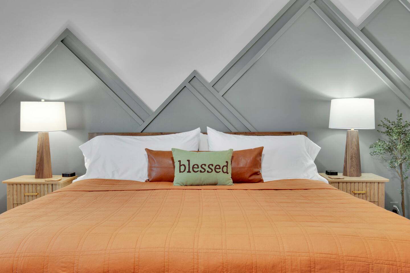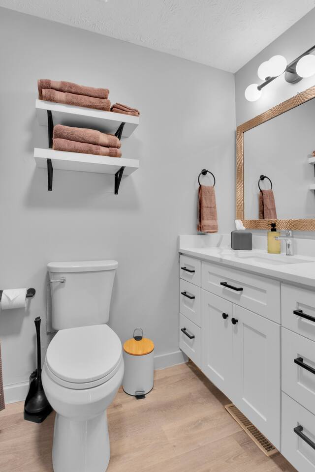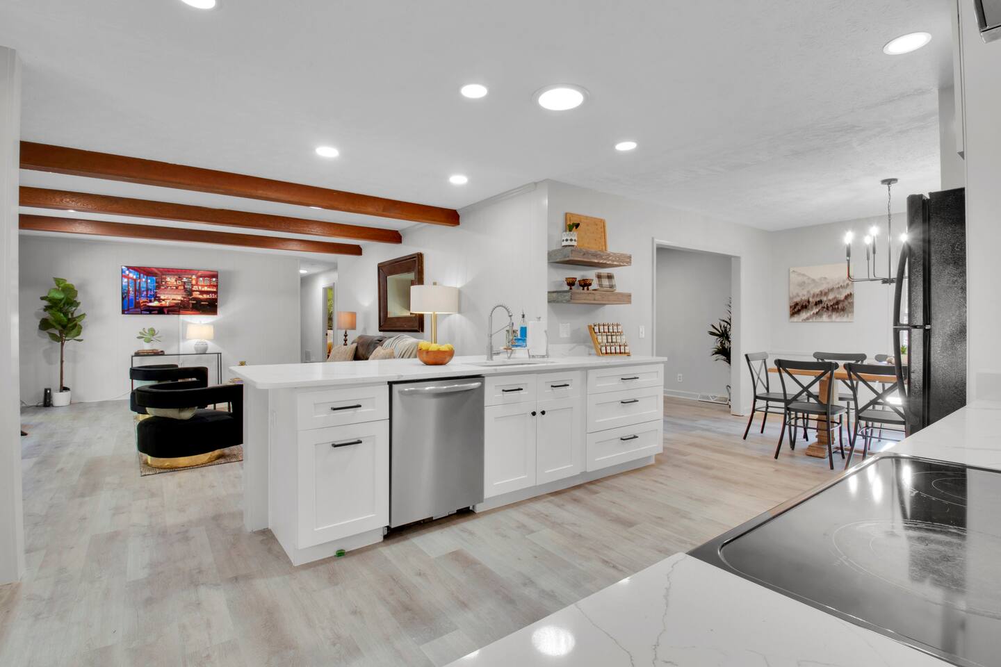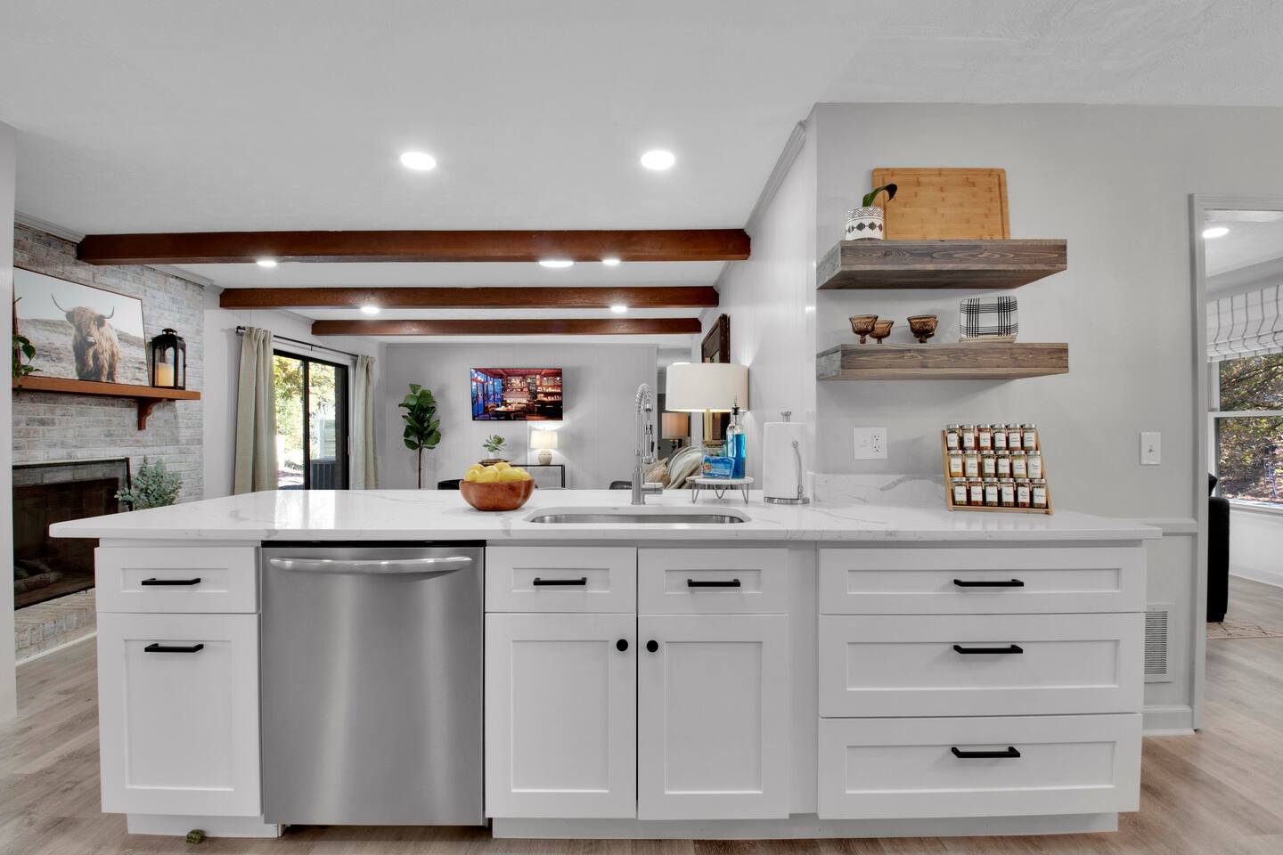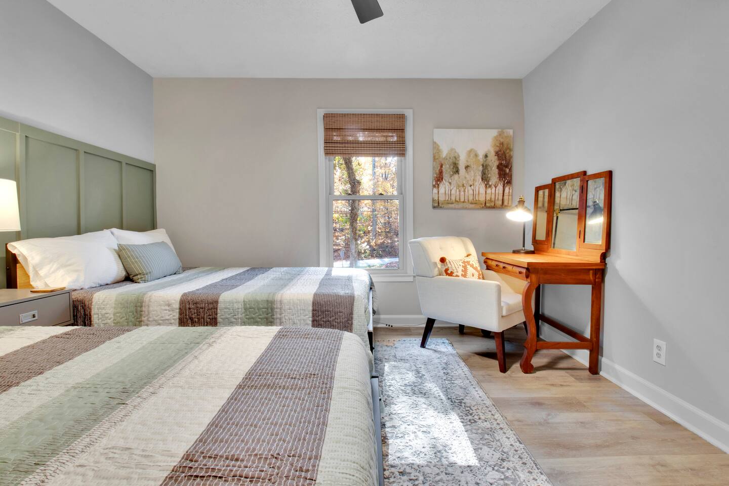 Master bedroom has a 12" Green Tea Memory Foam King bed with an ensuite walk-in shower and TV 2nd bedroom has the same king mattress with a TV 3rd bedroom has two 12" Memory Foam Full beds. Central Guest Bathroom with Tub/Shower Hi Speed Internet and desk area. Keurig pods and coffee pot, filters, Onsite washer & dryer laundry soap, spacious kitchen stocked with spices, olive oil, salt/pepper, Ninja blender, garbage bags, ziplocks, toilet paper, and paper towels. One large TV in the main living room, as well as a second TV in the family room. Large bathpatio space with fire pit, outdoor tables and seating, gas grill, corn hole and ping pong in the garage. We offer firewood too! Great outdoor spaces on the front and back for reading a book or enjoying conversations with friends and family! The mural on the side of our home was painted by my daughter. :)
