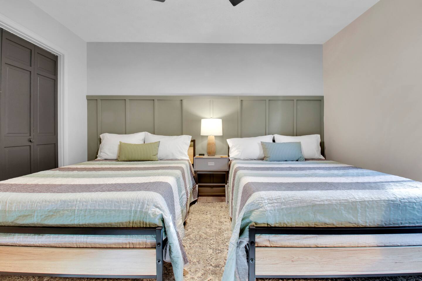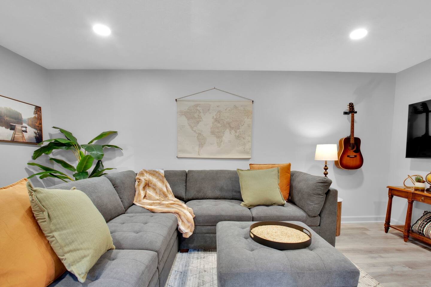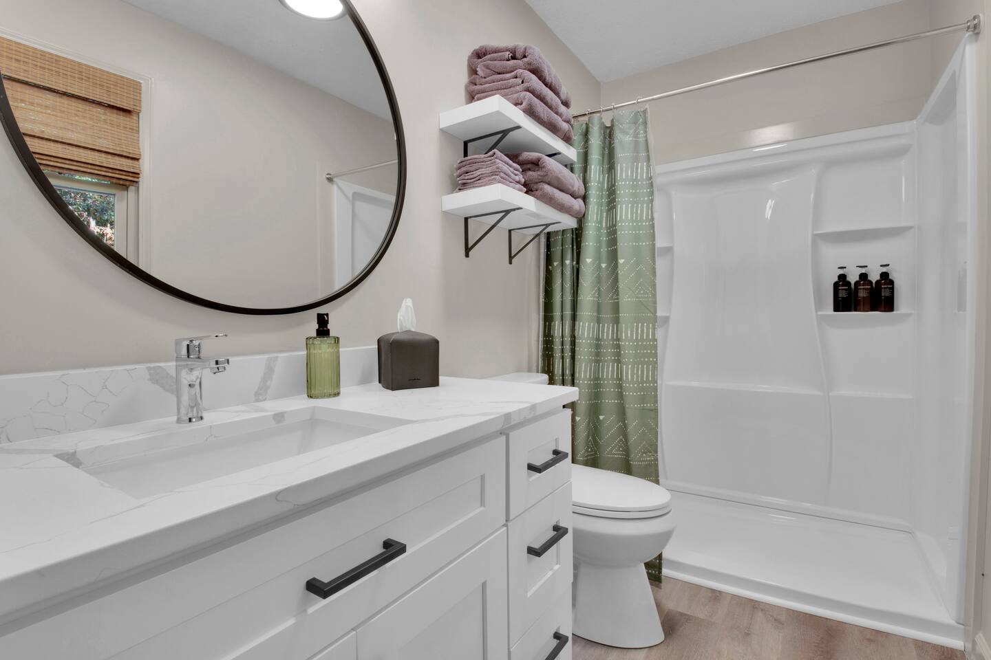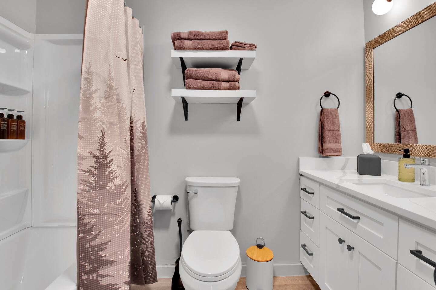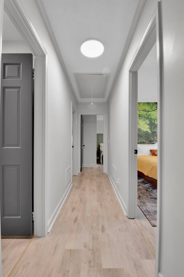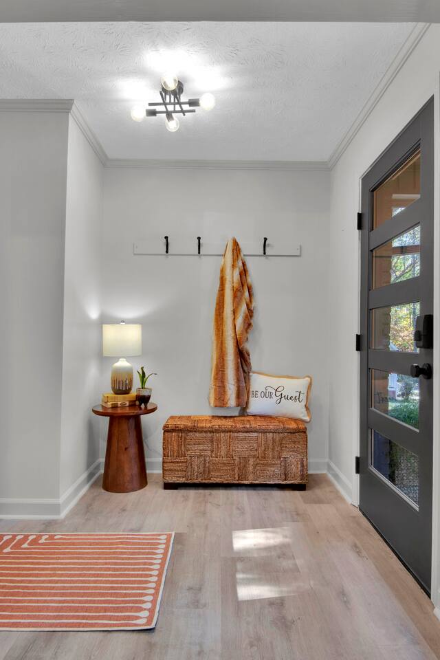 Master bedroom has a 12" Green Tea Memory Foam King bed with an ensuite walk-in shower and TV 2nd bedroom has the same king mattress with a TV 3rd bedroom has two 12" Memory Foam Full beds. Central Guest Bathroom with Tub/Shower Hi Speed Internet and desk area. Keurig pods and coffee pot, filters, Onsite washer & dryer laundry soap, spacious kitchen stocked with spices, olive oil, salt/pepper, Ninja blender, garbage bags, ziplocks, toilet paper, and paper towels. One large TV in the main living room, as well as a second TV in the family room. Large bathpatio space with fire pit, outdoor tables and seating, gas grill, corn hole and ping pong in the garage. We offer firewood too! Great outdoor spaces on the front and back for reading a book or enjoying conversations with friends and family! The mural on the side of our home was painted by my daughter. :)